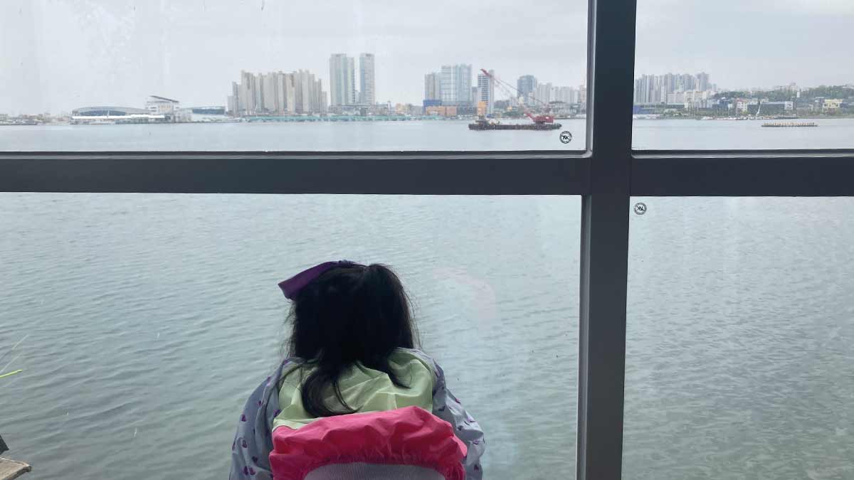 칠성조선소와 마주한 청초호는 잔잔 물결로 아이의 호기심을 자극한다.