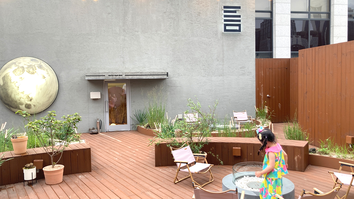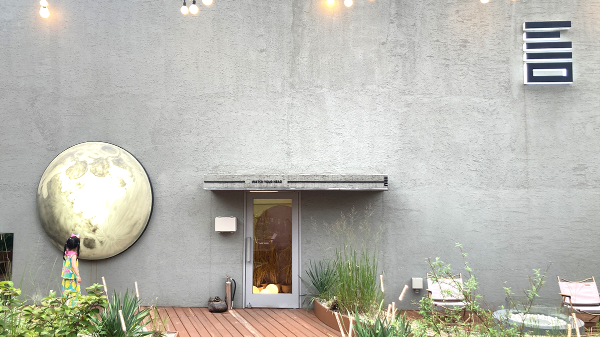 회색벽에 둥근달이 박혀있고, 멋진 조경 경계로 불멍 할 수 있는 공간들이 마련되어 있다.